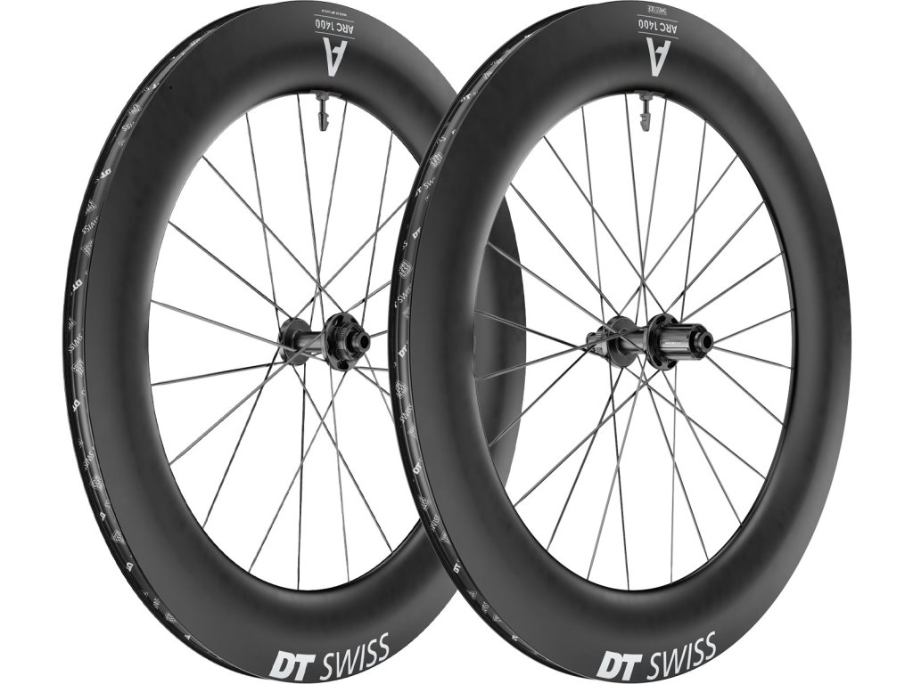 Nová řada Aero kol DT SWISS ARC 1400 přináší spoustu novinek, které tyto kola posunují další krok kupředu. Vyšší profily a patentovaná výroba zcela nových ráfků, kdy právě výšky 85mm dodávají lepší setrvačnost v rychlostech, širší 22mm vnitřní šíře ráfků zlepšují přilnavost a dokonce ještě i snižují valivý odpor. Aby bylo zaručeno i nízké váhy, přední kola byly zapleteny jen na 20 paprsků, což stále umožnuje vysokou tuhost do spurtů. Tato řada kol je zaměřena na co nejrychlejší jízdní parametry a za tímto účelem je optimalizován každý detail a komponent - náboje řady DT 240 EXP, paprsky AeroComp II...