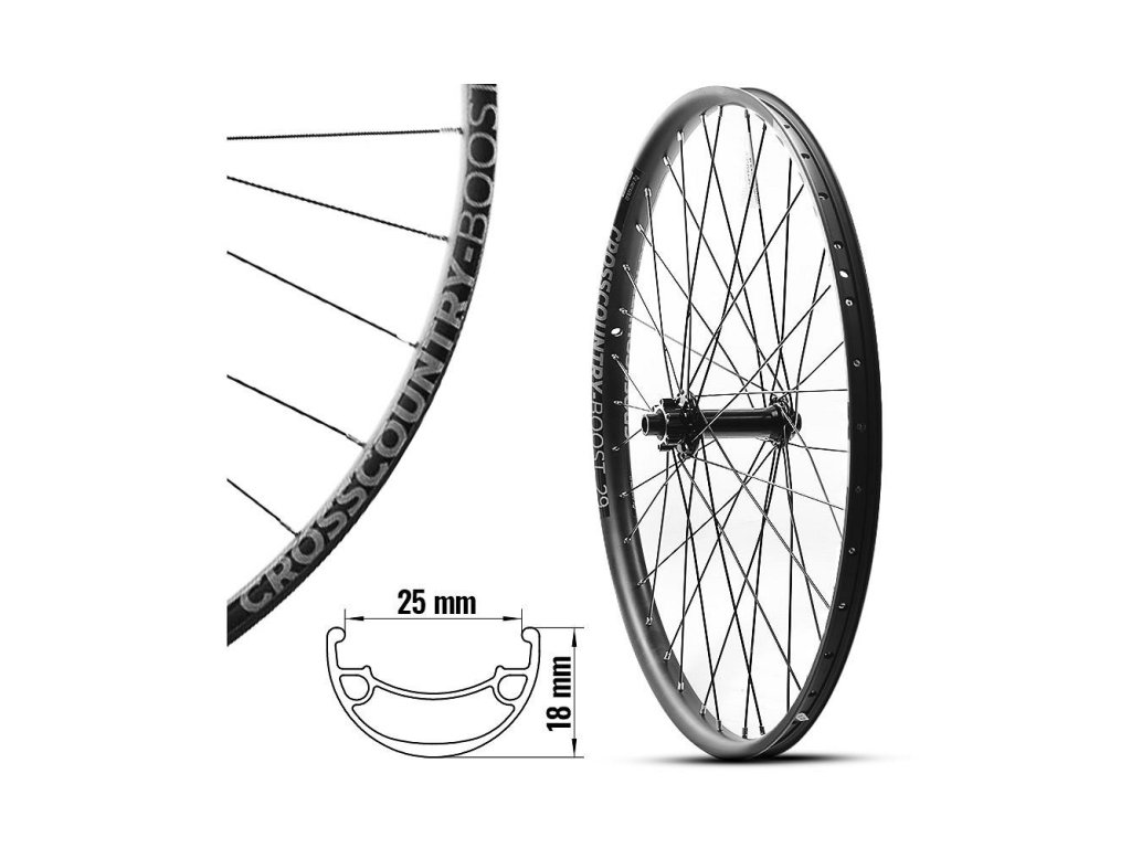 Odolné přední kolo pro horská kola s Alu dvoustěnným ráfkem, nábojem s průmyslovými ložisky a uchycením pro 15mm pevnou osu (délka 110 mm - BOOST). Kompatibilní s brzdovými kotouči na 6 šroubů