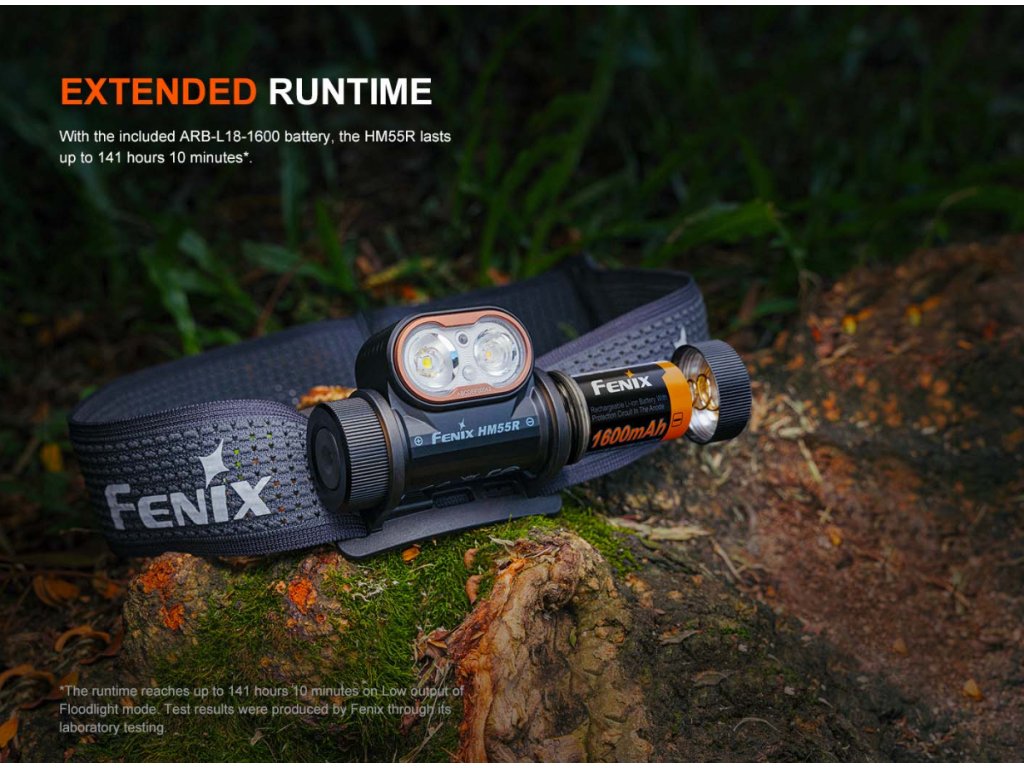 Lehká, výkonná a nekompromisně všestranná. To je nabíjecí čelovka Fenix HM55R, navržená pro každou situaci. Díky kompaktnímu Li-ion akumulátoru typu 18350 váží pouhých 105 gramů, ale její maximální výkon 1200 lumenů s dosvitem až 175 metrů vás ohromí. Nabízí tři typy svícení – dálkové, široké a červené – takže máte vždy po ruce to správné světlo, ať už prozkoumáváte terén, pracujete v dílně, nebo si jen chcete číst ve stanu. Dálkový reflektor vytváří dobře zaostřený světelný paprsek s dalekým dosvitem a druhý reflektor má světelnou stopu velmi širokou a plynulou. Světelný tok dálkového reflektoru je až 1200 lumenů, reflektor s širokým kuželem nabízí maximální výkon 350 lumenů a neutrální odstín světla s vysokým indexem kvality podání barev CRI >90 (Color Rendering Index). K dispozici je také červené světlo a blikačka o síle 5 lumenů. K napájení používá jeden Li-ion akumulátor typu 18350 s kapacitou 1600 mAh, který je součástí balení a nabíjí se přes moderní USB-C konektor přímo v čelovce. Čelovku lze v nouzi napájet také akumulátory RCR123A (16340) i jednorázovou baterií CR123A. Čelovka je opatřena širokým pohodlným popruhem. Popruh je perforovaný pro rychlý odvod potu a opatřený reflexními prvky, které zajišťují dobrou pasivní viditelnost při běhu po silnici.
