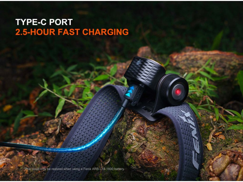 Nabíjení - Odklopte protiprachovou krytku a zapojte nabíjecí kabel USB-C do nabíjecího portu čelovky. Po dokončení nabíjení protiprachovou krytku nasaďte zpět. Během nabíjení svítí indikátor červeně. Po plném nabití se rozsvítí zeleně. Běžná doba nabíjení je 2 hodiny s USB zdrojem 5 V/1 A pro zcela vybitou čelovku. Během nabíjení lze čelovku používat, ale doba nabíjení se tím prodlouží a dostupné režimy výkonu závisí na aktuálním stavu nabití baterie. Poznámka: Lze nabíjet akumulátory Fenix typu 18350 a 16340/RCR123A (3,6-3,7V).