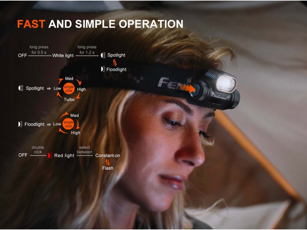 Zapnutí/vypnutí a přepínání režimů - Bílé světlo se zapíná podržením spínače po dobu 0,5 sekundy, do červeného světla se čelovka zapne dvojitým rychlým stiskem spínače. Režimy výkonu zapnuté barvy světla se poté přepínají krátkým stisknutím spínače. Světlo se opět vypne jeho podržením po dobu 0,5 s.