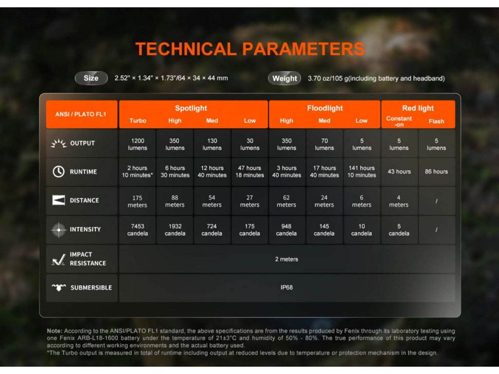 Všechny parametry čelovky (světelný tok, doba provozu na baterie, vodotěsnost, dosvit a nárazuvzdornost) jsou změřeny v souladu s normou ANSI/NEMA FL 1-2009.
