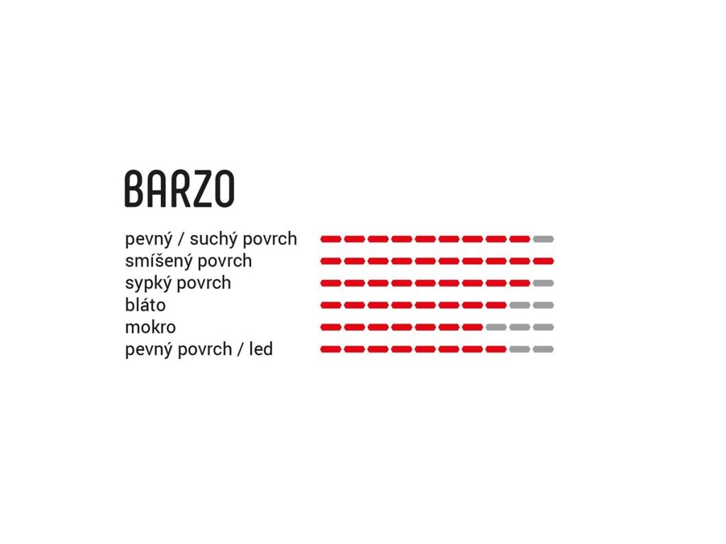 BARZO Rychlý XC plášť, který se ale neztratí ani na technicky náročnějším trailu. Střední část je navržena s ohledem na co možná nejsnazší odvalování při zachování velmi dobrého gripu. Jednotlivé knoby jsou na plášti rozmístěny ve „V“ formacích, díky čemuž má plášť špičkové samočisticí schopnosti. Jejich čtvercový tvar pak poskytuje dostatek stability a odolnosti. Každý knob je navíc opatřen lamelou pro maximální jistotu v zatáčkách. Bezdušová verze. Konstrukce kordu a použití " XC-RACING" , NYLON 120 TPI, odlehčený skinwall bok pláště v hnědé barvě. Kevlarová patka. 4C- Čtyři směsi v jednom plášti. Inovovaná Grafen 2.0 směs pro ještě vyšší odolnost, delší nájezd a maximální grip za mokra.Doplňkové parametry